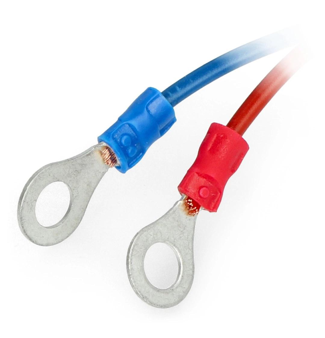 Dwa przewody (długości 90cm) zakończone oczkowymi konektorami podłączamy pod śruby klem akumulatora. Urządzenie posiada wbudowane gniazdo bezpiecznika – dodatkowe zabezpieczenie przeciwzwarciowe naszej instalacji.